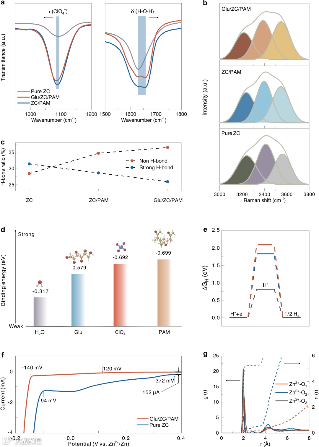 图1. (a) 各种电解质的傅立叶变换红外光谱;(b) 电解质在O-H伸缩振动区域的拟合拉曼光谱;(c) 电解质中强H键和非H键的比例; (d) 不同分子与水分子的结合能; (e) 裸Zn、葡萄糖/Zn和聚丙烯酰胺/Zn吸附H+的吉布斯自由能(ΔGH)。