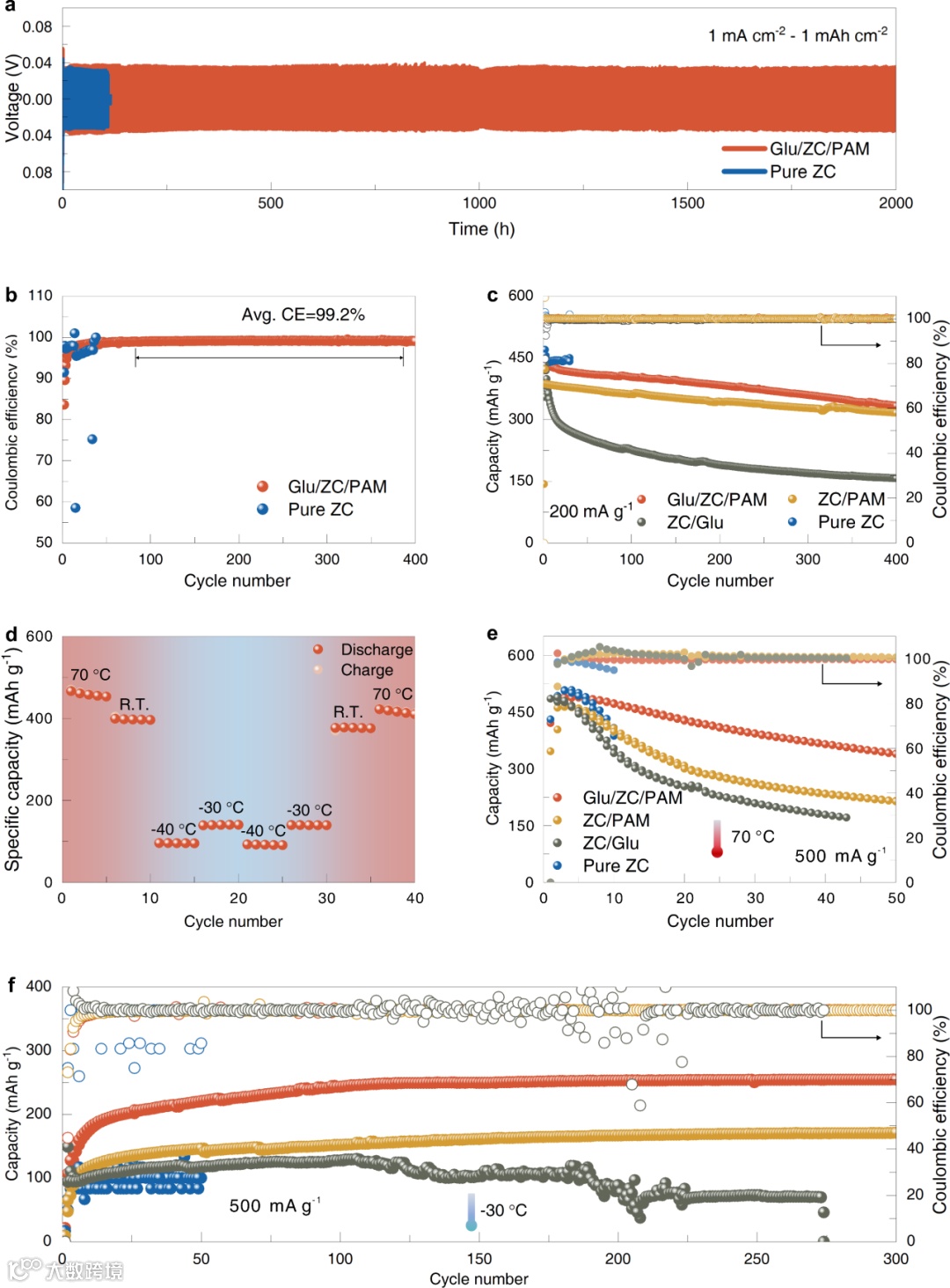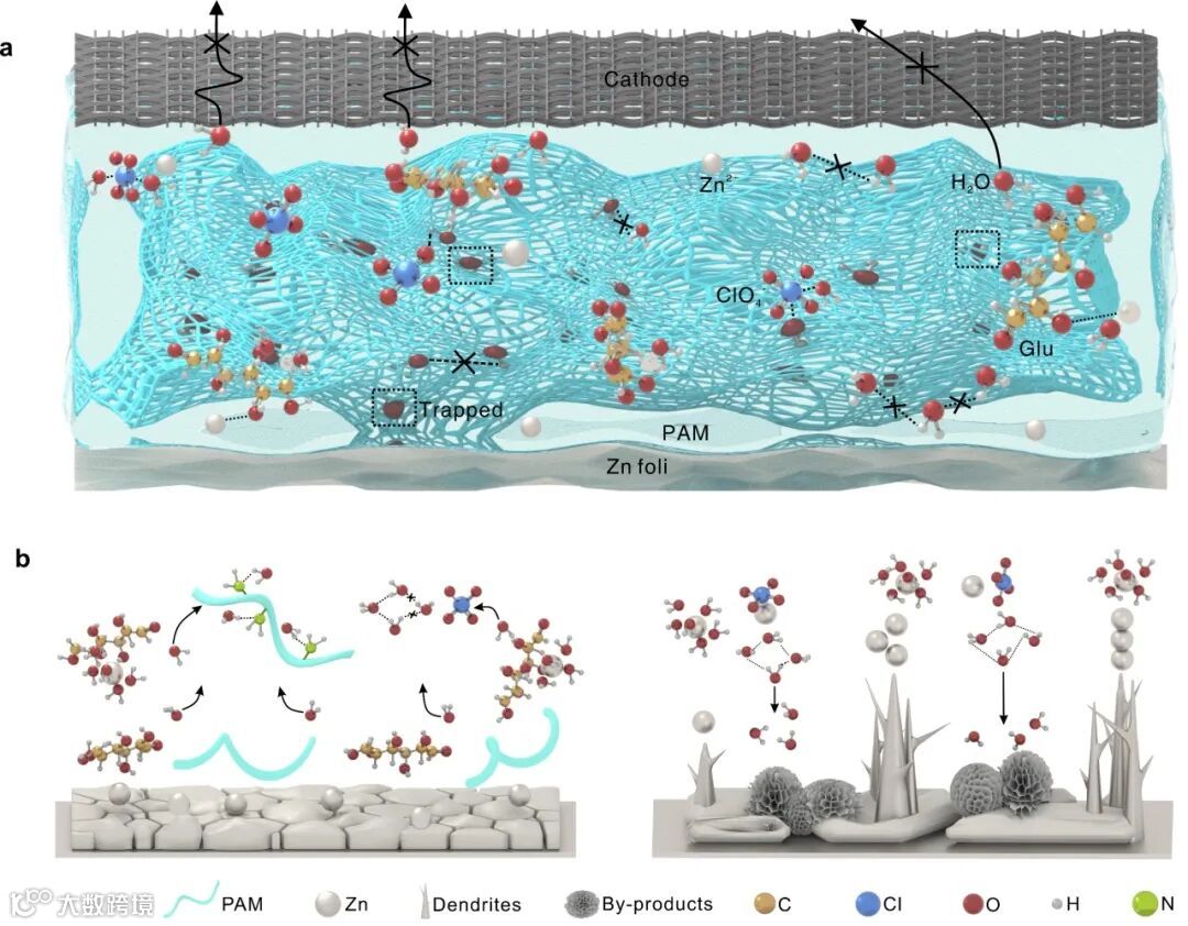 液体电解质中体相水固有的高度不稳定性,会导致电解质在零度以下容易结冰;而界面处的水会大量蒸发并伴随与金属锌发生活跃的副反应,从而在高温下加剧副产物。利用聚丙烯酰胺链-NH2对水分子的锚定可以破坏水分子团簇之间的氢键网络,从而降低电解质冰点;ClO4-阴离子更倾向于与周围水分子形成紧密离子群,进一步稳定了水分子。Zn2+与葡萄糖分子之间的竞争配位排斥了[Zn(H2O)x(ClO4-)y]z+结构内部的溶剂水,抑制了界面水的活性,有助于释放ClO4-阴离子去吸引水分子。所制备的水凝胶可同时调节水的聚集模式和Zn2+溶剂化结构,从而降低水的活性,并减弱阳极/电解质界面上由脱溶剂化的水引发的寄生反应。