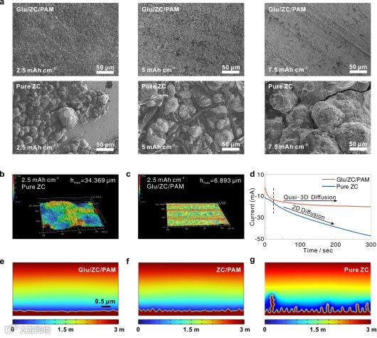 图2. (a) 在5 mA cm-2 恒定电流密度下,所制备凝胶电解质(上图)和液体电解质(下图)中 Zn 沉积的SEM图像;(b) 液体电解质和 (c) 凝胶电解质中 2.5 mAh cm-2 面容量对应下的Zn 3D数码显微图像;(d) 过电势为-150 mV时的 CA 曲线;(e) Glu/ZC/PAM电解质、(f) ZC/PAM电解质和(g) 纯水系电解质中Zn/电解质界面的COMSOL模拟。