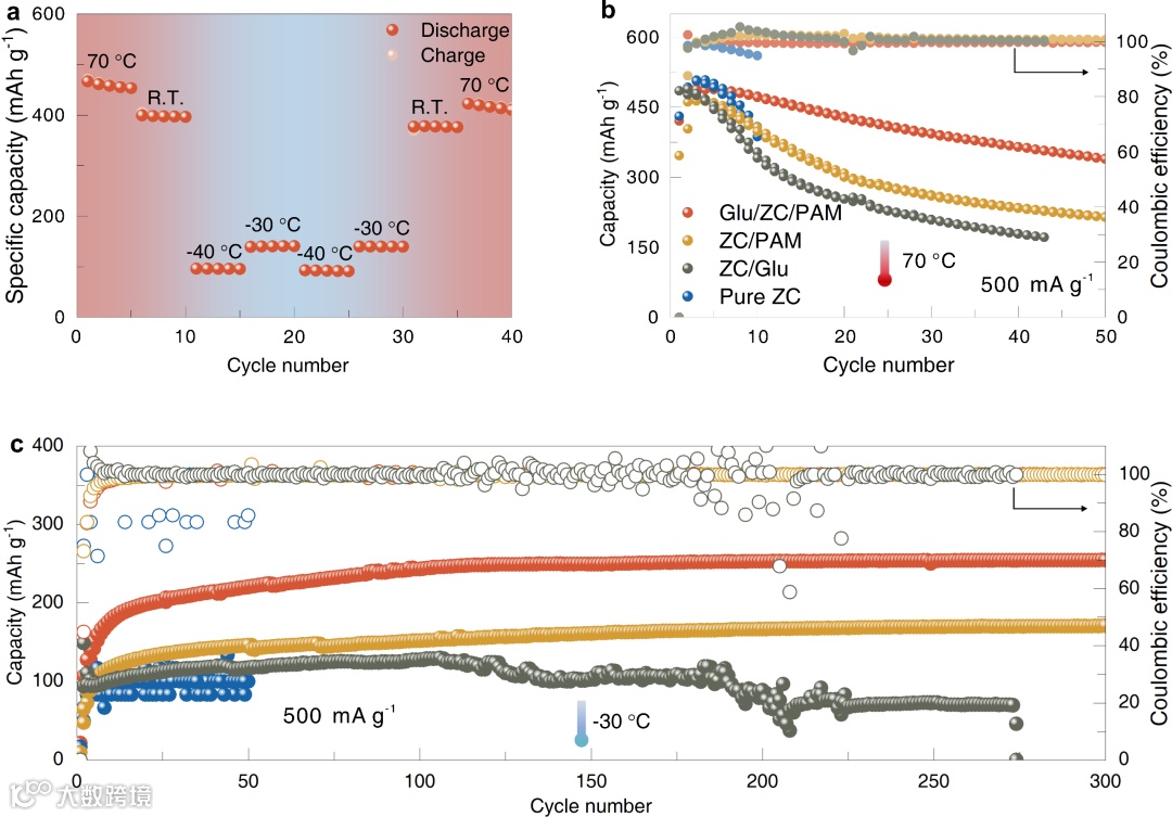 不可逆的电解质相变和加速的寄生反应会极大损害锌离子水电池的气候适应性。由于水活性会影响电解质凝固点、电化学稳定窗口和界面锌沉积行为,因此是改善水系电池温度适应性的关键切入点。相比于液态电解质,水凝胶电解质具有防渗漏特性、结构稳定性和可调节的机械柔韧性,对其进行合理的结构设计可作为抑制水活性的有效策略。然而,目前所报道的电池充放电比容量在极端条件下远不能令人满意,尤其是考虑到季节和纬度因素,这不利于水系锌电池的广泛应用。最重要的是,蕴藏于水分子配位环境、Zn2+溶剂化和Zn/电解质界面的耐温机制也亟待分析。本篇报道提出一种高电导率和强保湿性的水凝胶电解质,利用相关离子物种对水分子的锚定和锌离子溶剂化层的调节,有效打断水分子团簇,提升了水的共价性和稳定性,从而拓宽电化学窗口并能在-40~70 ˚C内稳定工作,为极端环境下电池的运行提供了新思路。