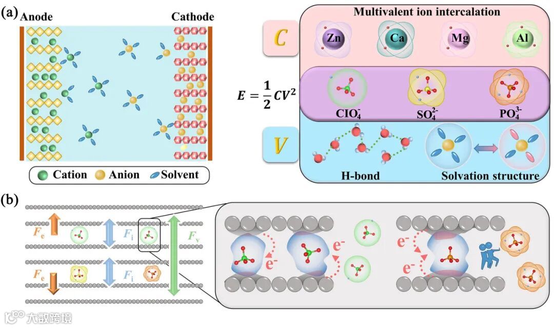 在双离子电池中,阴离子和阳离子共同参与电极的电化学反应。当石墨作为正极时,有多种阴离子可参与石墨插层反应,但大多数是单价阴离子。通常,阴离子的离子半径较大。当这些较大的阴离子嵌入石墨正极时,会产生较大的位阻。此外,由于石墨层间空间有限,能够容纳的阴离子数量也有限。相比单价阴离子,多价阴离子嵌入石墨时可提供更多电子,更有效地利用石墨有限的层间空间。因此,多价阴离子嵌入石墨电极的理论比容量通常高于单价阴离子。然而,多价阴离子的嵌入也面临一些挑战。首先,多价阴离子的电荷密度较高,使得其在去溶剂化、与石墨的吸附及嵌入过程与单价阴离子明显不同。这种变化会影响石墨正极的电化学性能,包括比容量、倍率性能和稳定性等方面。目前,对多价阴离子嵌入石墨正极的研究相对较少,深入理解这些过程对优化石墨电极设计和提升其电化学性能至关重要。