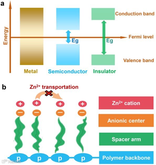 图4. (a)不同材料的费米能级示意图。(b)粘结剂的有限离子输运示意图。