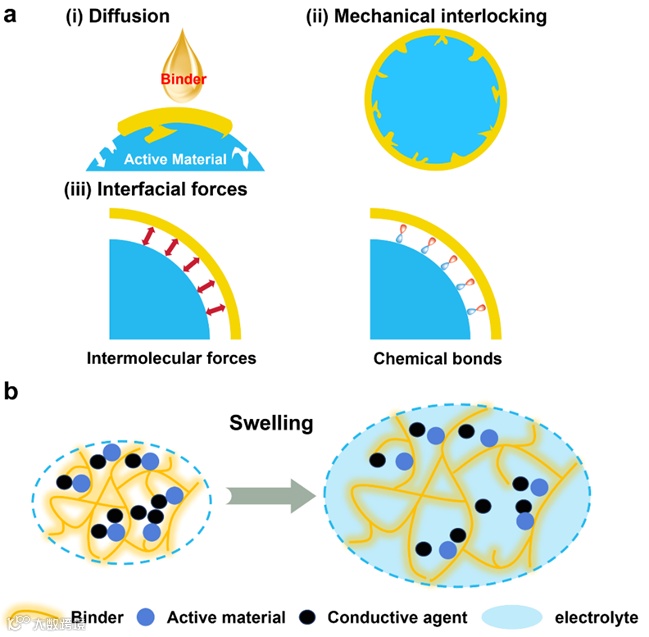 图3. (a) 粘结剂的结合机理示意图。界面作用力包括分子间作用力和化学键。(b) 粘结剂聚合物在电解液中的溶胀行为示意图。