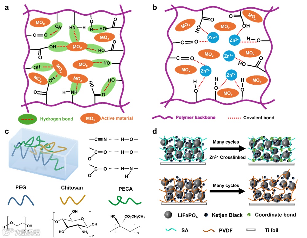 图5. (a) 粘结剂聚合物的不同基团与活性物质表面和粘结剂自身形成氢键的示意图。(b) 聚合物基团与Zn2+形成共价交联网络以稳定活性物质的示意图。(c) 交联微观结构示意图及粘结剂氢键机理。由聚乙二醇(PEG)、壳聚糖和2-氰基丙烯酸乙酯(ECA)制备的水基粘结剂。(d) SA与Zn2+形成交联网络示意图。