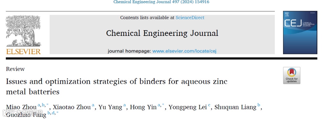 近日,湖南理工学院周苗&尹红副教授团队和中南大学方国赵教授团队在Chemical Engineering Journal期刊上发表了题为”Issues and optimization strategies of binders for aqueous zinc metal batteries”的综述文章。本工作主要对已经商业化或具有实际应用潜力的粘结剂进行了分类和整理,并对主要粘结剂的应用进行了讨论。然后,详细介绍了粘结剂存在的不足和内部影响因素,并根据研究现状提出了粘结剂的优化策略。最后,对当前粘结剂在实际应用中遇到的挑战和未来的研究思路进行了展望。本文第一作者为湖南理工学院周苗博士。