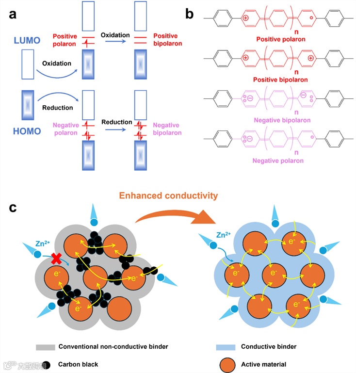 图6. (a) 共轭聚合物通过极化子输运的导电机理。(b) 氧化还原过程中聚苯乙烯化学结构变化以增强导电性的设计。(c) 导电粘结剂提高导电性示意图。