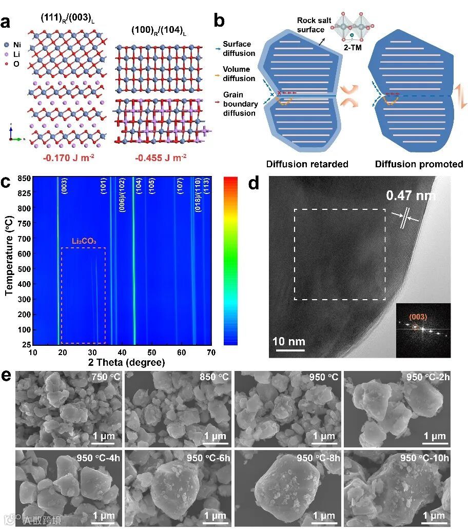 粘附功计算结果表明废旧NCM正极表面的岩盐相与体相层状相之间结合紧密(图3a),在高温烧结过程中颗粒与颗粒之间会形成含有岩盐相的晶界。由于岩盐相与层状相之间稳定的晶界及岩盐相2-TM缓慢的离子扩散通道,含有岩盐相的晶界处的表面扩散、体相扩散及晶界扩散都较为缓慢,从而抑制高温下一次颗粒的融合,最终烧结得到纳米一次颗粒的团聚体,而一致的层状相晶界则会促进物质传输和晶界扩散,有利于固相体系中晶粒的生长(图3b)。因此通过引入一个预烧过程,在未达到晶粒生长的温度下预先将表面岩盐相转化为层状相(图3c-d),可以重新激活表面的生长活性,最终实现固相烧结中的晶粒生长(图3e)。