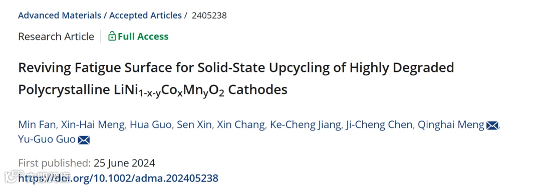 近日,来自中国科学院化学研究所的郭玉国研究员和孟庆海副研究员,在国际知名期刊Advanced Materials上发表题为“Reviving Fatigue Surface for Solid-State Upcycling of Highly Degraded Polycrystalline LiNi1-x-yCoxMnyO2 Cathodes”的研究论文。在该工作中,作者采取固相法对高度失效的多晶NCM正极进行单晶化再生,指出废旧正极表面的岩盐相层是阻碍固相烧结中晶粒生长的关键因素,并通过调节烧结工艺,在较低温度下预先将表面岩盐相转变为层状相,从而形成一致的层状相晶界以促进高温下的离子扩散和晶界融合,最终得到了微米级的单晶正极颗粒。得益于更加完整的形貌和稳定的结构优势,再生后的单晶正极展现了优异的电化学性能,远优于采用常规直接再生得到的正极材料,并在高温和高截止电压下与原始多晶NCM相比具有更好的循环稳定性。
