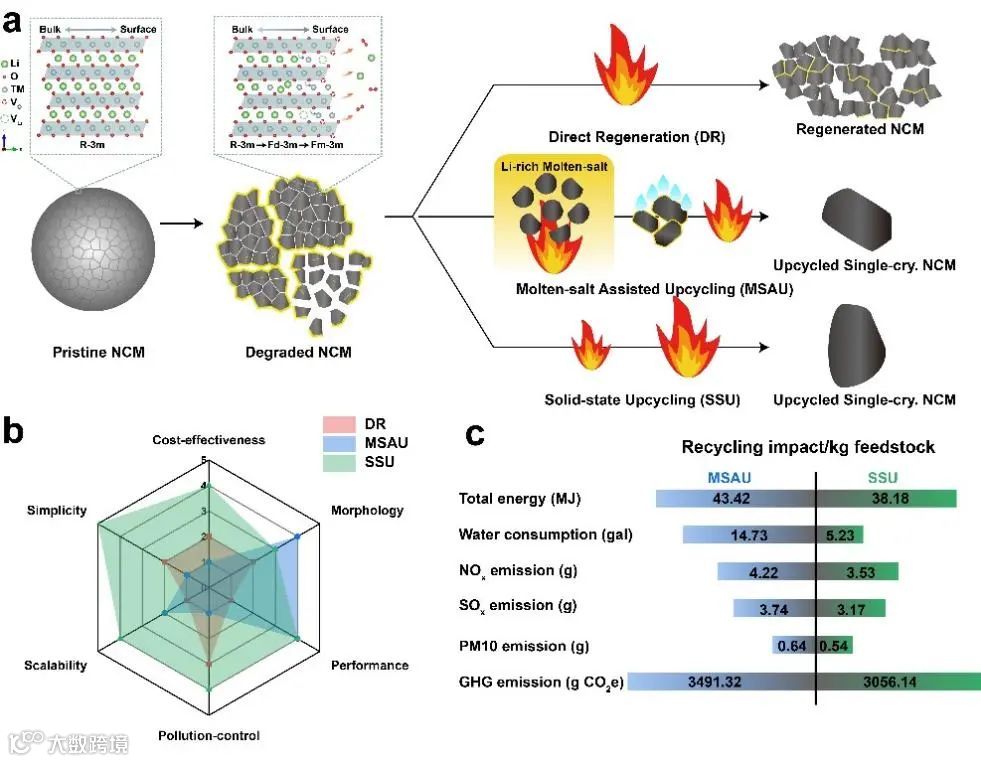 图1. 高度失效多晶NCM正极的不同再生路线对比。