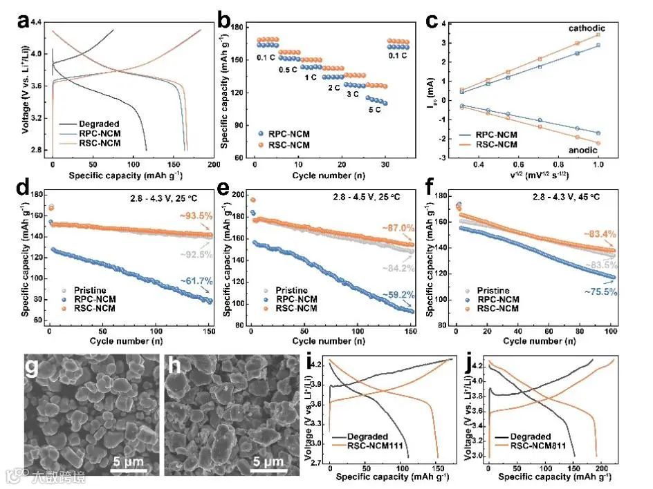 通过优化烧结工艺,最终得到平均粒径约2微米的再生单晶正极材料,其展现出优异的电化学性能。相较于通过传统补锂再生得到的再生多晶正极材料,虽然二者容量恢复接近(图4a),但再生单晶正极具有更加优异的倍率性能(图4b-c)及循环稳定性(图4d-f),在室温和2.8-4.3 V的循环条件下,1C150圈的保持率从61.7%提升显著至93.5%,与原始多晶正极性能相近,且在更为苛刻的高温和高截止电压条件下,再生单晶正极的电化学性能甚至超过了原始多晶正极。再生单晶正极优异的电化学性能源于更加完整的单晶形貌和更少的结构缺陷,从而促进了充放电过程中的离子传输和结构稳定。本工作中的固相升级化再生方法也同样适用于低镍NCM111和高镍NCM811失效正极,表明该方法具有良好的普适性(图4g-j)。