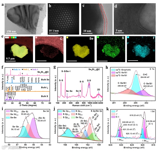 图2. Se2SI1.5@C的形貌和结构表征。(a)典型的Se2SI1.5@C纳米片的TEM图,相应的(b)SAED和(c)显示出Se2SI1.5@C的核壳结构的TEM图(d)HRTEM(e)STEM以及EDS mapping图(f)纯S、Se、I2和Se2SI1.5@C的XRD图谱(g)Se2SI1.5@C的Raman光谱(h-k)Se2SI1.5@C中四种元素的XPS精细光谱和拟合曲线。