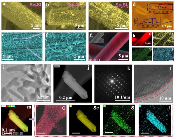 图3.(a-c)三种不同碘含量的Se2SIx@C-carbon cloth的形貌和结构表征。(d)Se2SI@C的AFM图和高度图(e)Se2SI@C-carbon cloth的SEM图(f)图e的局部放大图;(g-h)Se2SI@C的EDS mapping图(a)Se2SI@C的TEM图;(b)一个典型的Se2SI@C的STEM图像(c)SAED和(d)显示Se2SI@C的核壳结构的HRTEM图和相应的(e)STEM和EDS mapping图。
