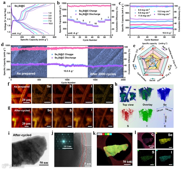 图5. Na-Se2SI@C-carbon cloth电池的电化学性能(a)不同电流密度下的充放电曲线(b)倍率性能(c)不同负载量下的循环性能(d)在10.0 A g-1下的长循环测试(e)性能对比图(f)反应前(g)后Se2SI@C-carbon cloth电极的ToF-SIMs图(h)在充满电状态下,Se2SI@C-carbon cloth的ToF-SIMs三维视图(i)循环后的TEM图像(j)HRTEM和SAED图和(k)单个Se2SI@C纳米片的STEM图像以及对应的(i)元素分布图。