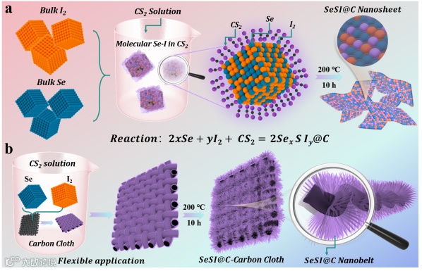 图1. (a)SeSI@C和(b)SeSI@C-Carbon cloth电极的合成过程示意图。