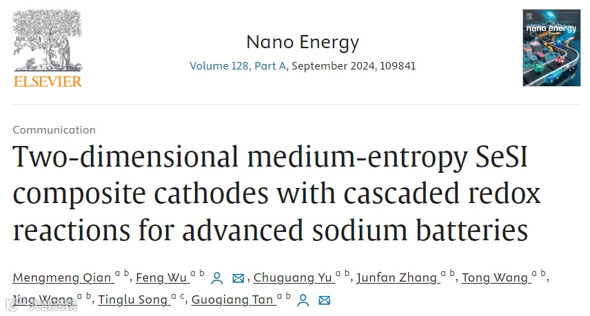 尽管多硫化钠在碳酸盐溶剂中的溶解度低于多硫化锂,有助于减少副反应的发生;多硒化钠的电子电导率和离子电导率高于多硒化锂,提够钠离子电池的反应动力学,然而,基于单一元素Na–S、Na–Se和Na–I2电池的能量输出和循环寿命均表现不佳。基于以上现状,近日北京理工大学吴锋院士、谭国强教授团队在国际知名期刊Nano Energy上发表题为“Two-dimensional medium-entropy SeSI composite cathodes with cascaded redox reactions for advanced sodium batteries”的研究工作。该工作提出了一种新型的三元转换型Na−SeSI@C级联电池配置,将三个连续的氧化还原反应组合在单个电池系统中,旨在实现高容量和高电压,从而实现SIB中的高比能量输出。