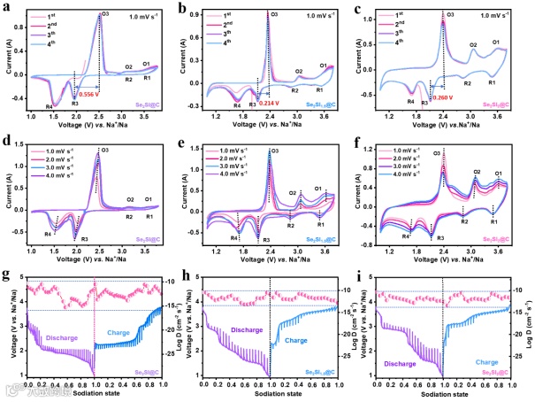 图 4(a-c)三种不同碘含量的Na-Se2SIx@C-carbon cloth电池的CV曲线(前四周)和(d-f)不同扫速下的CV曲线(g-i)电池的GITT曲线和Na+离子的扩散系数。