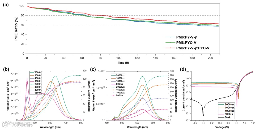 最后,利用最大功率点跟踪(MPPT)技术评估了全聚合物太阳能电池(PSCs)的运行稳定性。70小时后,二元器件的PCE下降到初始PCE的80%,170小时左右又下降到60%。相比之下,三元器件在170小时后仍能保持约70%的初始 PCE。在 PM6:PY-V-γ 系统中引入PYO-V提高了器件的光热稳定性。我们还使用不同的LED光源研究PYO-V的室内光伏性能,其中2600K是最佳条件,因为它的发射光谱与PYO-V非常匹配。在2600K LED灯的2000 lux光强下,PM6:PYO-V的PCE达到了24.0%,这也是迄今为止报告的室内全聚合物室内光伏的最高性能之一。