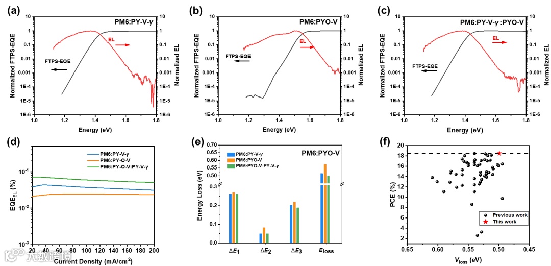 为了量化使用PYO-V 受体的有机太阳能电池器件中的能量损耗,我们进行了实验研究。结果表明,与PM6:PY-V-γ 和PM6:PYO-V 相比,PM6:PY-V-γ 混合物具有更低的非辐射复合和电压损耗。三元器件的Eloss(0.499 eV)是目前all-PSC中最小值,甚至超过了某些基于小分子受体的高性能器件。