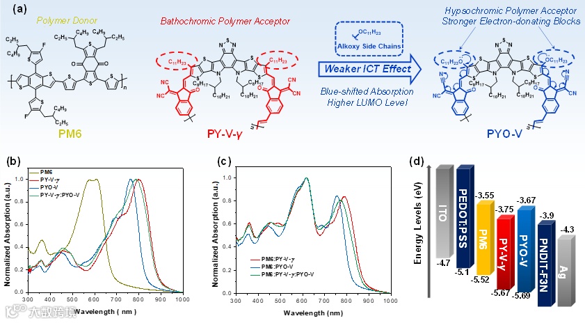 近期,香港科技大学颜河、于涵课题组合成并系统研究了一种烷氧基取代的聚合物受体(PYO-V),其噻吩分子上有一个传统的 Y 系列中心核。研究发现,相比于经典的PY-V-γ,烷氧基取代的PYO-V具有蓝移的光谱吸收和上移的LUMO能级,这得益于PYO-V较弱的ICT效应。当在 PM6:PY-V-γ 主体系中引入PYO-V 可实现互补的吸收光谱,并有效控制能量损失。因此,PM6:PY-V-γ:PYO-V 三元全聚合物太阳能电池(all-PSCs)器件的效率达到了18.5%(全聚合物太阳能电池最高效率之一),VOC为0.932 V,JSC 为25.9 mA cm-2,远高于基于PM6:PY-V-γ的器件(17.3%)。除了室外光伏技术,PYO-V 在室内光伏技术中也表现出其多功能应用的一面,其二元器件的效率达到24%,也是全聚合物室内光伏的最高效率之一。这项工作表明,烷氧基取代是调整聚合物受体光电特性和实现高效全聚合物太阳能电池应用的有效策略。