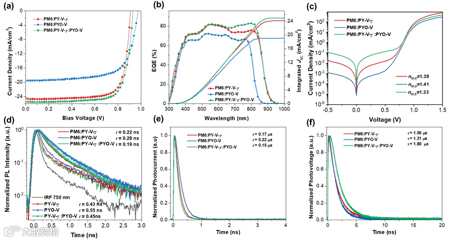 图2. (a)光伏特性曲线,(b)外量子效率曲线,(c)暗电流拟合理想因子(d)时间分辨光致发光测试(TR-PL),(e)瞬态光电流(TPC)和(f)瞬态光电压(TPV)测试。
