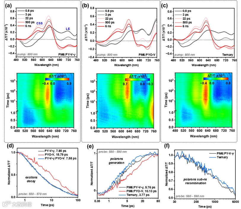 随后,作者利用瞬态吸收光谱研究了原始薄膜和混合薄膜的激子动力学。与PY-V-γ和PY-V-γ:PYO-V相比,PYO-V的激子衰减时间较慢。与二元共混物相比,三元共混物具有更快的空穴转移速率和较慢的衰减速率,从而实现更好的 JSC和FF。这种改善归功于添加PYO-V后优化的供体-受体界面形态。