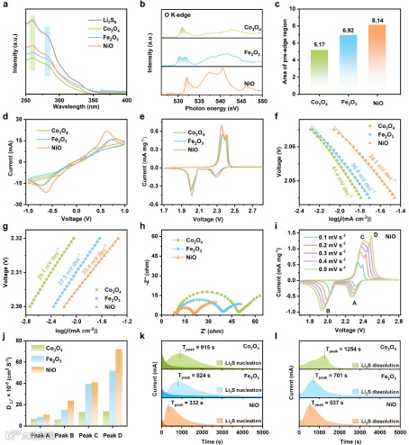 通过吸附实验证明NiO对多硫化物表现适中的相互作用。进一步通过O K边测试,证明NiO中强的Ni-O共价性可以维持循环过程中的结构稳定性。进一步通过CV曲线,阻抗测试,Tafel斜率等电化学表征,证明NiO与多硫化物组成的界面微环境显著提升了硫的还原反应动力学。