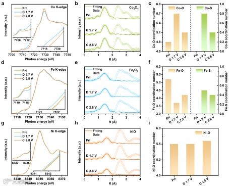 我们利用TM K边的XANES和EXAFS研究了TMO电催化剂在循环过程中的电子结构和局部配位环境。在三种TM K 边中,Ni K 边在循环过程中表现出较小的偏移,确保了多硫化物的吸附和快速的界面电子传输,从而在构成了一个稳定的界面微环境。进一步通过扩展边的拟合,研究循环过程中金属氧化物配位数和键长的变化。Ni-O键长和配位数在循环过程中基本不变,表明Ni的局部配位环境保存良好,界面微环境稳健。这保证了Ni d电子和S p电子之间稳定的相互作用和顺利的界面电子转移,从而有效地加速了多硫化物的氧化还原转化。