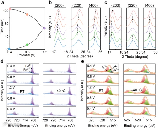 XRD和XPS测试技术分析了室温/低温下的晶体结构和价态变化。低温条件下嵌入电极材料的质子数量减少,对应的晶格体积变化减小,保证了电极材料在低温下的高效稳定运行。Fe2+/Fe3+和V3+/V4+的氧化还原反应在低温下受限,V4+/V5+的可逆转换是低温下的主要反应。结果表明选择适用于低温环境的电极材料具有重要意义,其中多电子反应的电极材料中关键的电子转移过程可能受到限制。