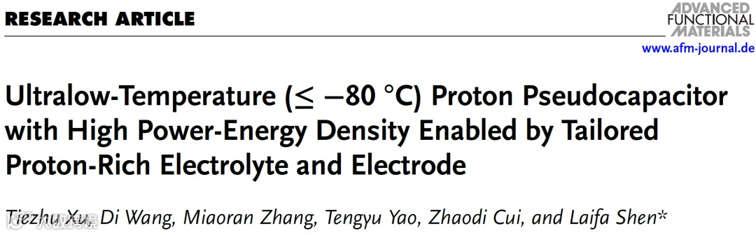 近日,来自南京航空航天大学的申来法教授在国际期刊Advanced Functional Materials上发表题为“Ultralow-Temperature (≤ −80 ºC) Proton Pseudocapacitor with High Power-Energy Density Enabled by Tailored Proton-Rich Electrolyte and Electrode”的研究文章。该文设计了具有超低冰点(低于−80 ºC)和高电导率(−80 ºC下7.89 mS cm−1)的抗冻富质子电解液,并耦合具有富质子结合位点的框架结构普鲁士蓝电极(VHCF),构建了一种极具前景的超低温质子赝电容器。通过综合表征技术和计算模拟,阐明了氢键诱导的溶剂化结构和物理化学性质。揭示了低温条件下VHCF电极的温度依赖性结构和价态变化,多电子转移反应受到温度控制从而抑制了容量输出。质子赝电容器(VHCF//6 M H2SO4//MoO3-x)在−80~25 ℃的温度范围内具有优异的电化学性能,在−80 ℃的超低温度下具有0~2.8 V的电压窗口和74.9 Wh kg−1的高能量密度。这种富质子电解液-电极设计原理为下一代极端条件电化学储能技术的发展提供了有效策略。