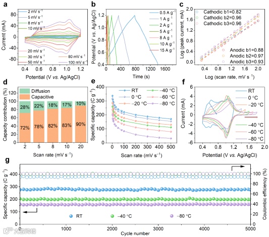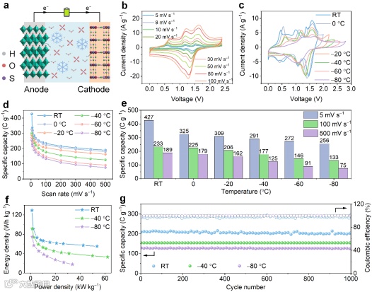 VHCF电极在6 M H2SO4电解液中表现出最高比电容(在2 mV s−1达到470 F g−1)和超高的倍率性能(100 mV s−1下保持2 mV s−1比电容的73%)。工作电位从室温下的0.4 V~1.2 V拓宽至−80 ºC 下的0.4 V~1.8 V,VHCF可以在扩大的电位区间中稳定工作。VHCF在6 MH2SO4电解液中具有卓越的低温性能,在−40 ºC和−80 ºC下仍保持室温容量的77.2%和59.6%,可在−80 °C超低温下稳定循环5000次。