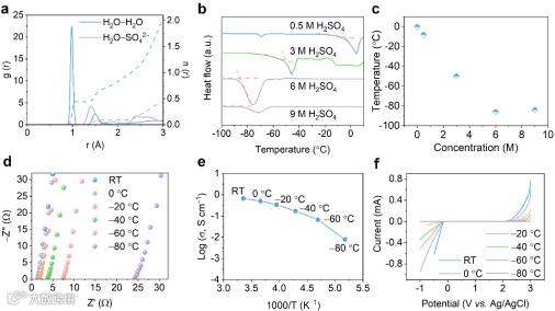在纯水中,H2O分子间O和H原子的静电作用形成了高强度的氢键网络,导致异常的高凝固点。与盐溶液类似,硫酸溶液中的离子充分电离,并与水分子形成新氢键。随着电解质浓度的增加(富质子电解液),电离的H+和SO42−的浓度急剧增加,促使大量水分子与SO42−形成氢键,降低了水分子的活性。低的凝固点和高的离子电导率理论上可以在富质子电解液中实现。Raman和FTIR测试表明O−H特征峰随着电解液浓度增大发生蓝移,大量水分子和SO42−配位,相应的水分子间的相互作用减弱,即强氢键数量减少,冰晶结构形成更加困难。其中具有富质子溶剂化结构的6 M H2SO4电解液在−40 ºC和−80 ºC下离子电导率分别达到172 mS cm−1和7.89 mS cm−1,实现了低凝固点(低于−80 ºC)和宽电化学窗口(−80 ºC下为−1~3 V)。