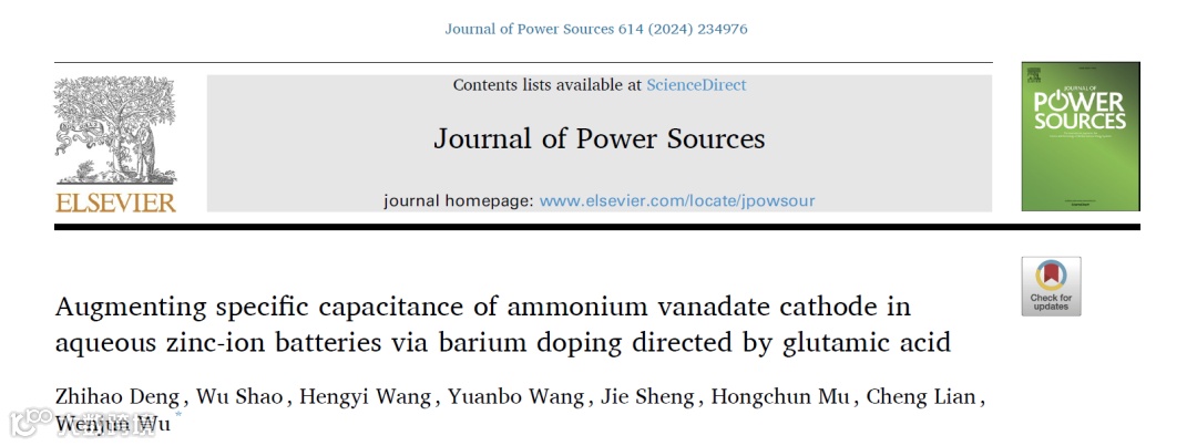 近日,来自华东理工大学的武文俊副教授,在国际知名期刊Journal of Power Sources上发表了一篇题为“Augmenting specific capacitance of ammonium vanadate cathode in aqueous zinc-ion batteries via barium doping directed by glutamic acid“的研究论文。该论文提出了利用谷氨酸为导向剂,通过优化BaCl2·2H2O的添加量,利用一步水热法成功合成了高结晶度的(NH4)2V4O9纳米花,并将其应用于水系锌离子电池(AZIB)的正极材料。研究发现,在最佳条件下,Ba2+的引入,可将钒基纳米花的层间距从9.817 Å增加到12.900 Å,大大降低了Zn2+在钒基正极材料中的扩散能垒,提升了其扩散系数。