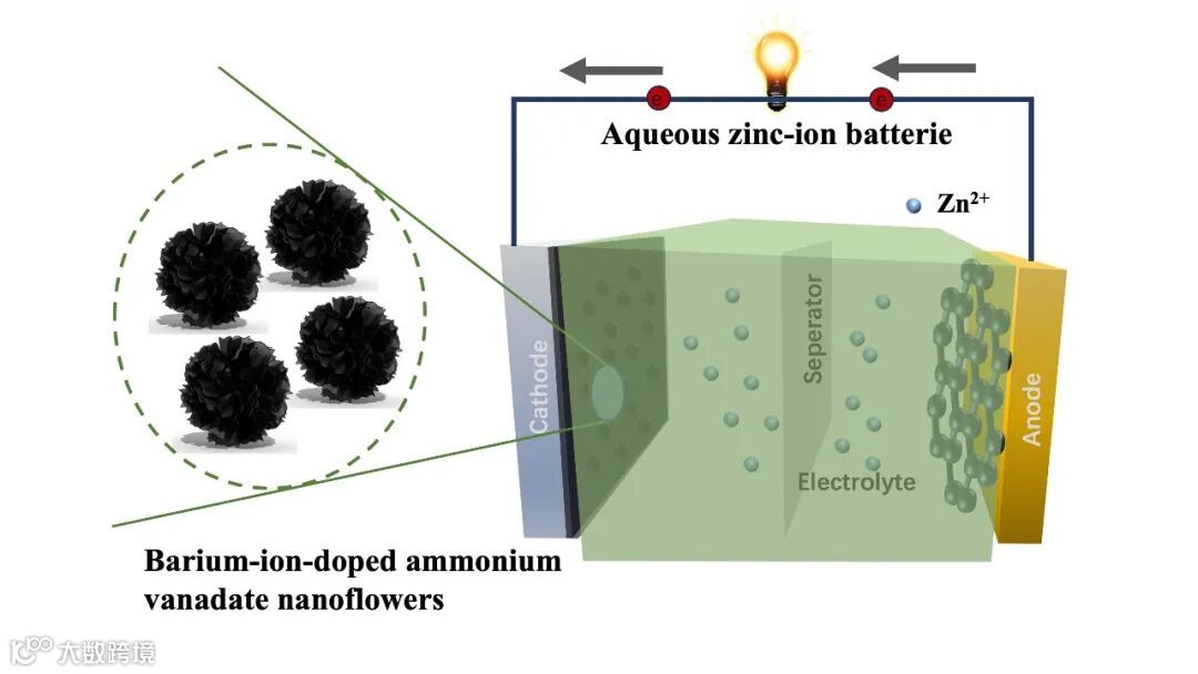 水系锌离子电池(AZIB),由于其Zn/Zn2+低的氧化还原电位(−0.76 V vs. SHE),极高的理论容量(820 mAh g−1)以及成本回报率高等优势,成为替代锂离子电池的最有竞争力的候选者之一。为了获得高容量和良好循环稳定性,人们选择包含层状结构,多孔结构以及纳米通道的正极材料展开研究,主要包括钒基材料、锰氧化合物、普鲁士蓝类似物和有机化合物等。而钒氧化合物,由于独特的层状结构,以及多步氧化还原过程,应用于AZIB显示出极大的潜力。但目前还存在导电性能和结构骨架稳定性差等问题有待解决。本篇聚焦一步水热法合成Ba2+掺杂的钒酸铵材料,随着Ba2+的引入,可将钒基纳米花的层间距增大,大幅降低了Zn2+在钒基正极材料中的扩散能垒,并且可形成大量暴露的活性位点,有利于离子快速扩散和氧化还原反应动力学。