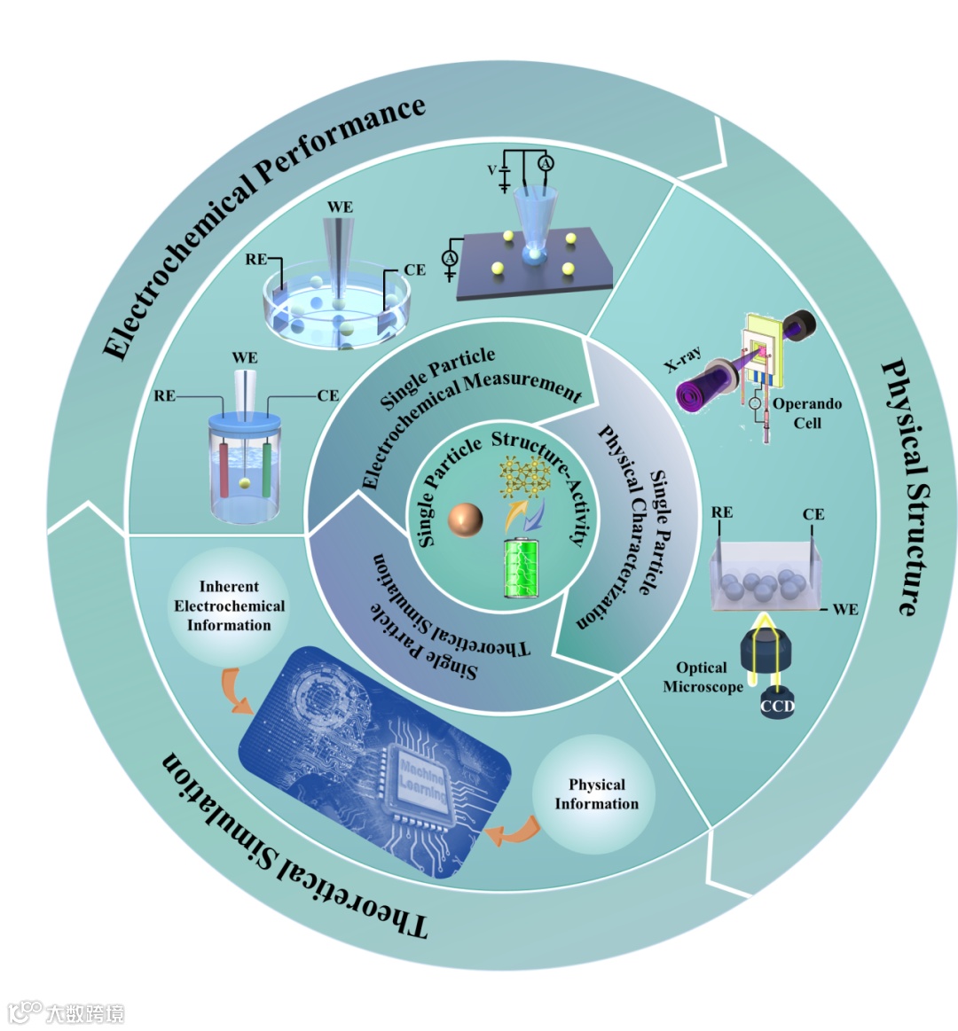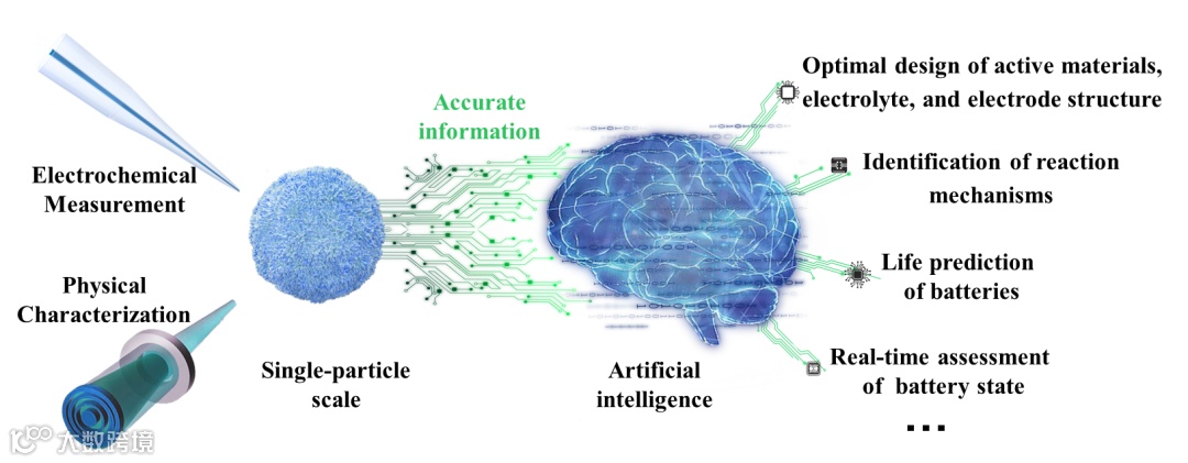 图7单颗粒水平电化学测量和物理表征提供准确的基础数据信息促进人工智能在电池研究中应用的示意图。