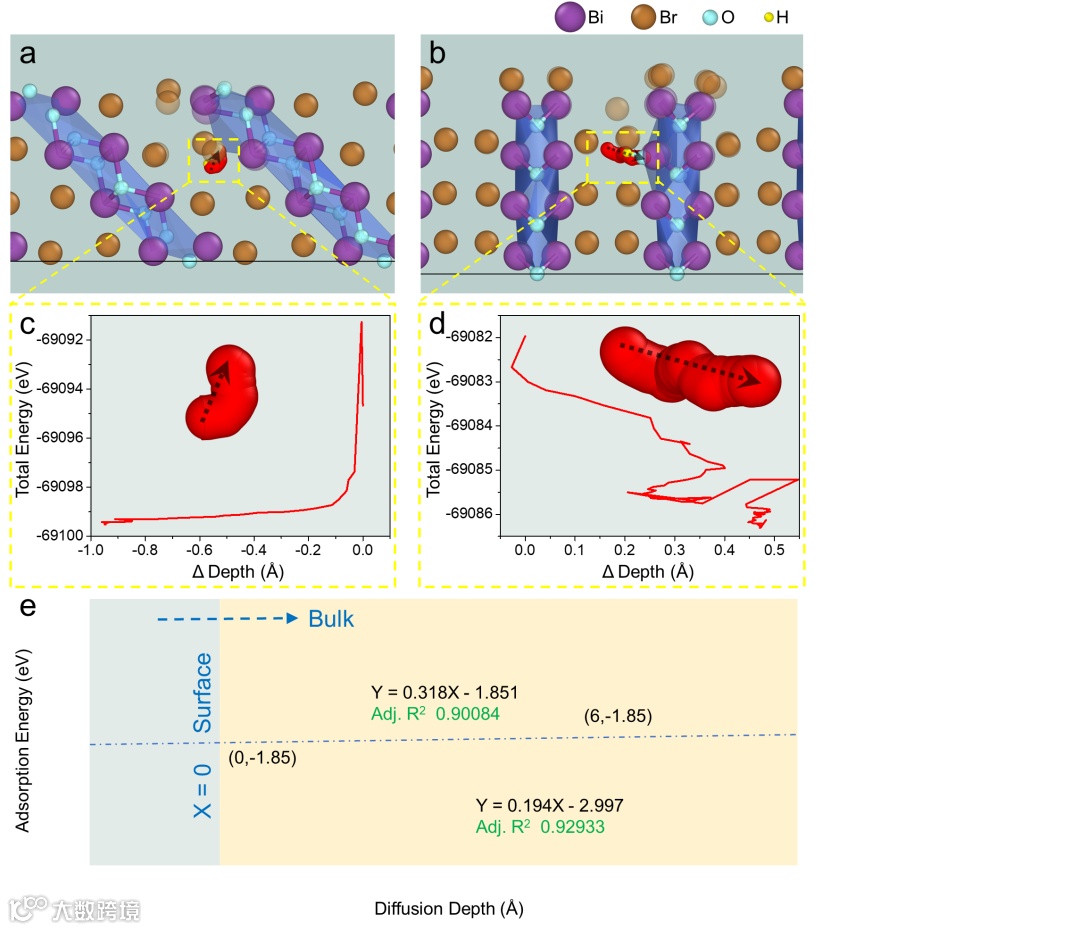 要点二:在BiOBr的(102)和(110)择优晶面中,OH−展现出不同的扩散路径和扩散行为。OH-在择优的(102)晶面基体中,OH−离子的扩散深度浅,且趋向于向表面扩散;而在择优的(110)晶面基体中,OH−离子的扩散深度深,且趋向于向体相扩散。这表明(110)晶面取向的BiOBr对于开发BiOBr的层空间存储更有效。