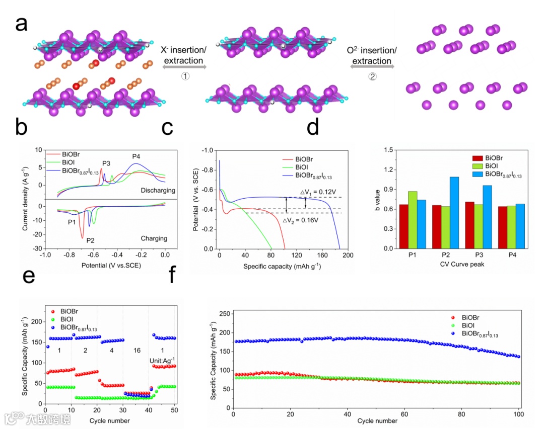 要点一:BiOBr、BiOI和BiOBr0.87I0.13均具有层状结构,其中BiOBr和BiOI主要是(110)和(102)的择优晶面,而I固溶的BiOBr0.87I0.13主要是(110)择优晶面。电极不同的择优晶面会表现出差异的离子扩散行为。