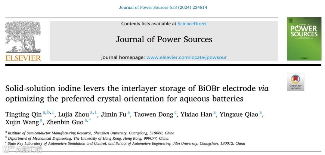近日,深圳大学郭镇斌团队在国际知名期刊《Journal of Power Sources》上发表了题为“Solid -solution iodine levers the interlayer storage of BiOBr electrode vi a optimizing the preferred crystal orientation for aqueous batteries”的研究文章。该研究利用简单的溶剂热方法将碘元素固溶到BiOBr层间,增强了优选的(110)晶面取向,这些晶面作为离子扩散通道的直接入口,并增强了与OH−的相互作用,从而优化了层间空间的利用。另一方面,固溶碘还有助于加速电荷转移动力学。这项工作提升了层状材料的层间储存能力,为最大化电荷存储和反应动力学中的层间空间利用提供了一个新的范式。