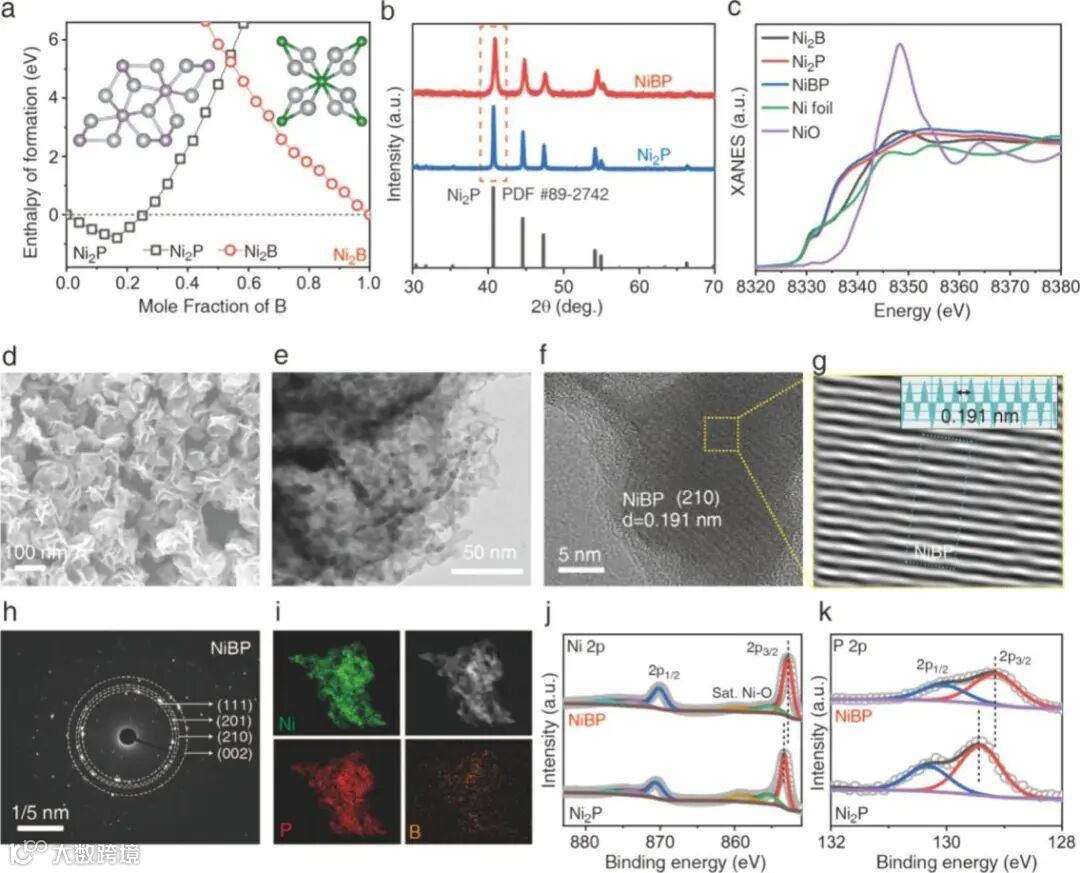 通过两步法合成超薄片状NiBP,采用泛函密度理论(DFT)进行第一性原理计算,研究掺杂相的热力学稳定性。SEM和TEM表征了超薄薄片聚集成花瓣的形貌特征,同时对硼元素的均匀掺杂加以验证。为了进一步研究掺杂对配位结构的调控,借助X射线吸收谱和近边扩展谱对Ni价态和Ni-P/B键长加以分析,证实了硼掺杂对电子结构的调控策略。