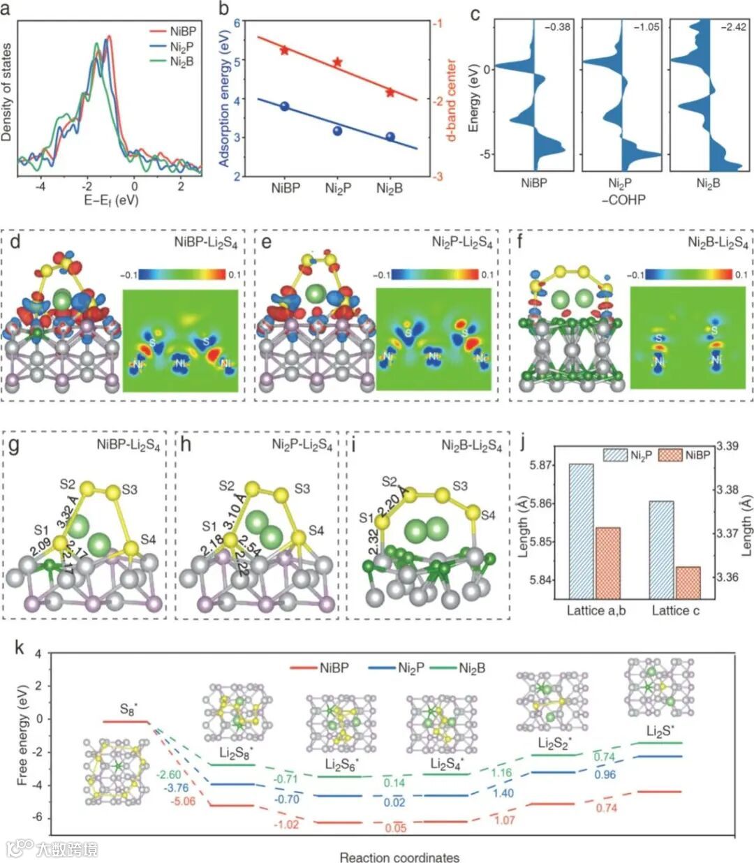 图2 通过DFT模拟和理论分析,深入探讨了多硫化物与催化剂之间的相互作用,揭示了NiBP如何通过电子结构调整来激活多硫化物