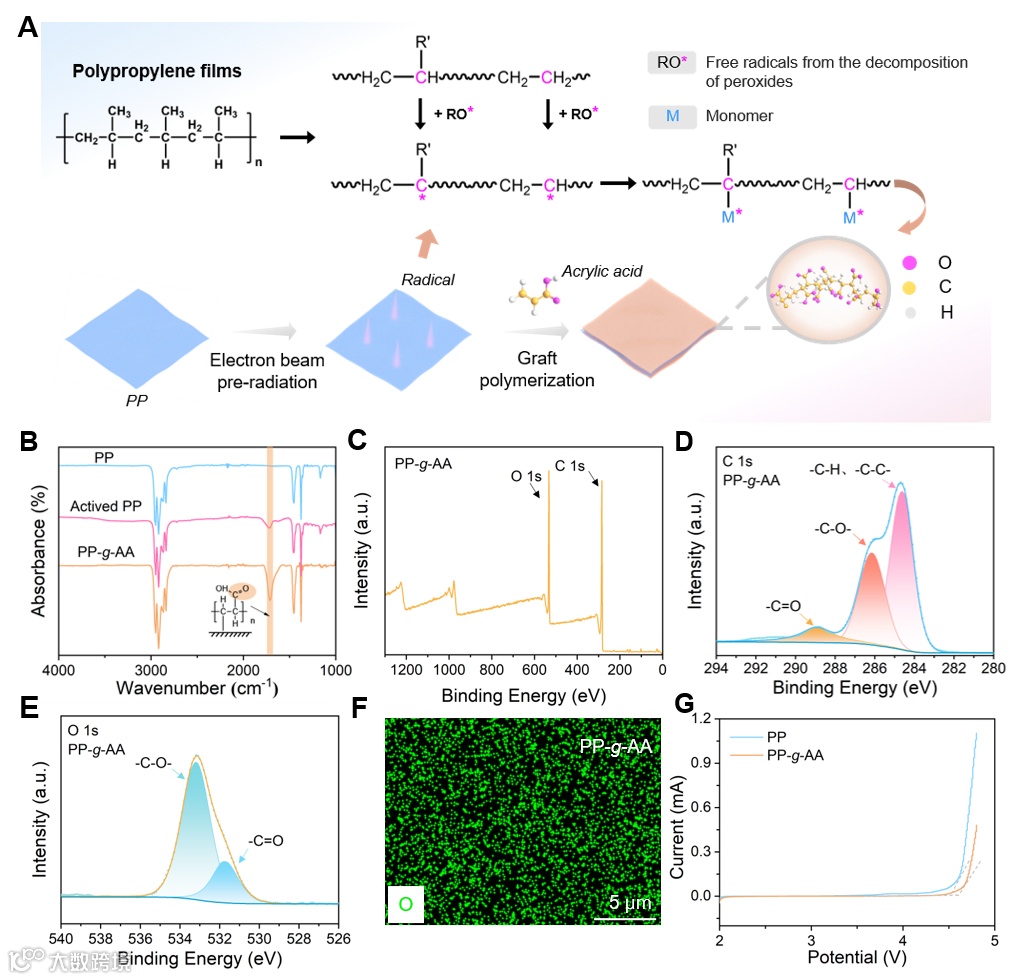 图2. PP和PP-g-AA隔膜的制备和表征。(A) 丙烯酸接枝隔膜的制备示意图。(B) PP、活性PP和PP-g-AA的FTIR光谱。(C-E)PP-g-AA的XPS分析。(F) PP-g-AA表面上O元素的映射图像。(G)商用PP和PP-g-AA隔膜的LSV曲线。