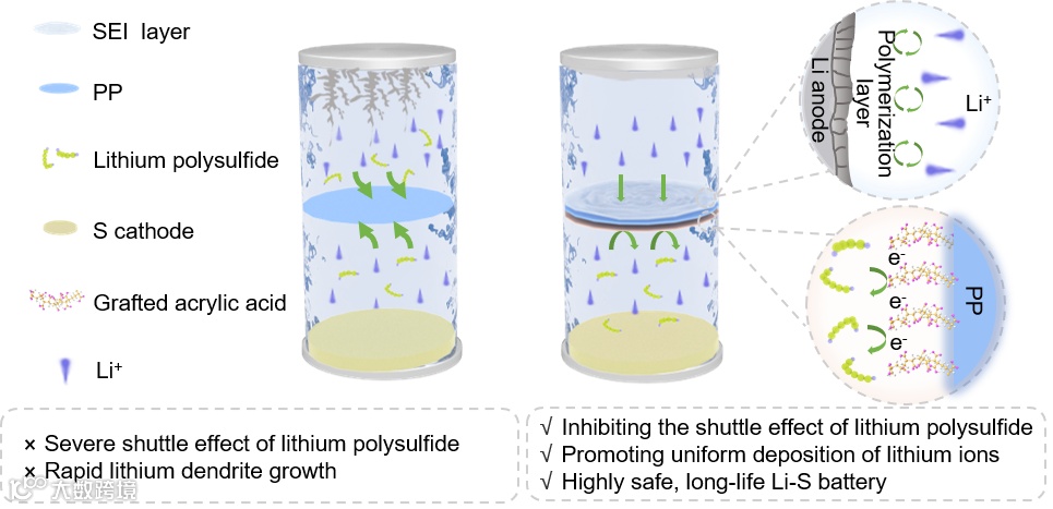 锂硫(Li-S)电池因其高正极理论比容量(1675 mAh g-1)和理论比能量(2600 Wh kg-1)而成为下一代储能技术最有前景的候选者之一,远远高于广泛应用于商业应用的先进锂钴氧化物电池。此外,硫正极因其储量丰富、价格低廉和环保而具有巨大优势。首先,锂倾向于与电解质反应,由于化学反应性高,形成不均匀的固体电解质界面(SEI)。一般来说,电解质诱导的SEI往往是不均匀和脆弱的,不可避免地会导致锂离子通量不均匀和不利的锂枝晶生长。同时,SEI在巨大的机械应力下容易开裂使新鲜锂的暴露。这种持续的裂解导致电解质的持续消耗,增加了形成“死锂”的风险,最终降低了Li-S电池的电化学性能。其次,S8在有机电解质中还原产生的可溶性多硫化锂(LiPSs)的扩散导致活性硫的不可逆损失、容量迅速下降和循环寿命短。同时,高阶LiPSs可以经过隔膜并扩散到负极,被锂金属负极还原,产生低阶LiPSs和不溶性Li2S2和/或Li2S,最终钝化负极锂。因此,开发出一种通过使用电负性丙烯酸接枝改性的多功能隔膜(PP-g-AA)实现无枝晶和高安全性锂硫电池。