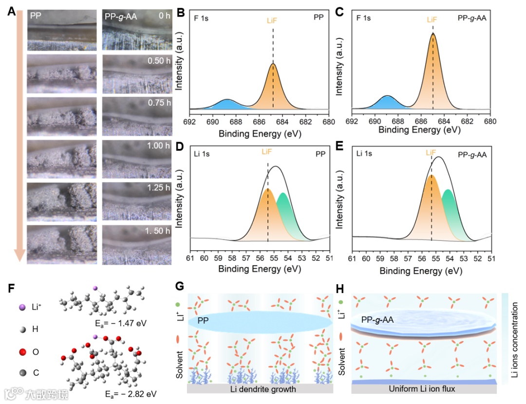 图4. (A) PP/PP-g-AA隔膜组装Li||Li对称光学电池的原位光学显微镜。PP (B) 和PP-g-AA (C) 组装的Li-S电池中锂负极F 1s XPS谱。PP (D) 和PP-g-AA (E) 组装的Li-S电池中锂负极Li 1s XPS谱。(F)Li+在PP(上)和PP-g-AA(下)上的吸收构型和吸附能。通过PP (G)和PP-g-AA (H)隔膜的Li+沉积行为的机理示意图。