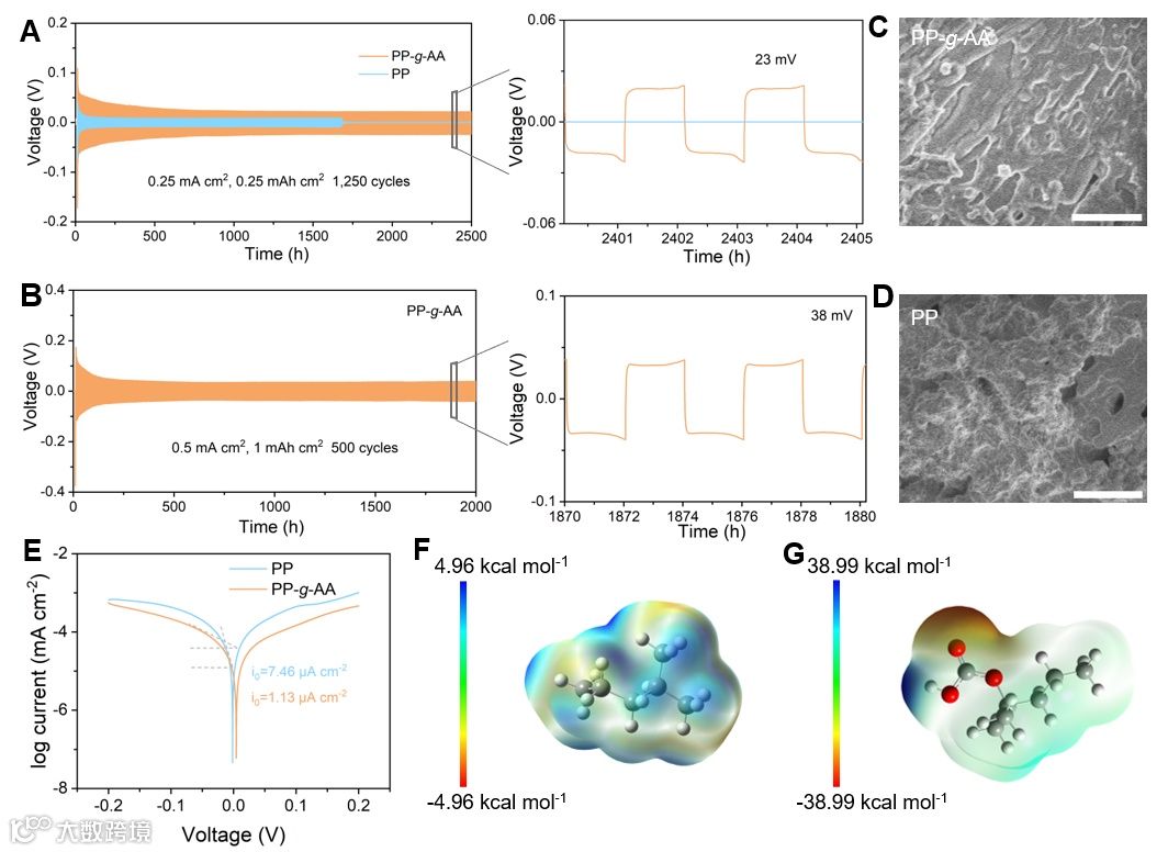 图3. (A) PP 和 PP-g-AA 隔膜在 0.25 mA cm−2, 0.25 mAh cm−2 下的 Li||Li 电池的恒电流循环曲线。(B) PP-g-AA在0.5 mA cm−2, 1 mAh cm−2条件下的Li||Li电池的恒电流循环曲线。在电流密度为0.25 mA cm−2, 0.25 mAh cm−2时,PP-g-AA (C) 和PP (D) 在第30个循环后的Li表面形态。(E) PP 和 PP-g-AA 的 Li||Cu 电池的Tafel曲线。(F) PP 和 PP-g-AA 的分子表面静电势。