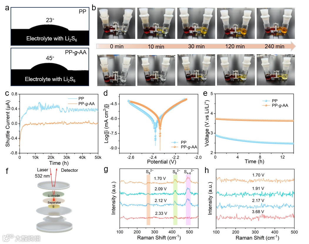 图5. (A) PP(上)和PP-g-AA(下)对10 mM Li2S6 的接触角。(B) 使用 PP 和 PP-g-AA 隔膜的H型电解池的LPSs扩散示意图。(C) PP、PP-g-AA隔膜组装Li-S电池的穿梭电流。(D) PP、PP-g-AA电位动力学极化曲线。(E) 使用 PP 和PP-g-AA隔膜组装 Li-S 电池的 OCV 变化。(F) 原位电化学拉曼测试电池的示意图。PP (G) 或PP-g-AA (H) 隔膜组装电池在给定电压下的拉曼光谱。