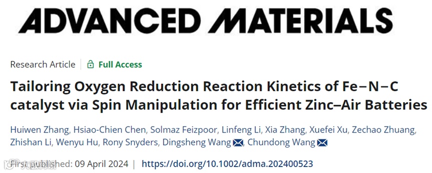 近日,来自华中科技大学的王春栋教授与清华大学的王定胜教授合作,在国际知名期刊Advanced Materials上发表题为“Tailoring Oxygen Reduction Reaction Kinetics of Fe−N−C catalyst via Spin Manipulation for Efficient Zinc–Air Batteries”的观点文章。该文章在双配体锌基沸石框架衍生的层状多孔空心碳上成功将与载体有化学键合的铁原子团簇锚定在单分散铁原子的周围,并利用实验和密度泛函理论计算来共同监测铁原子团簇对铁单原子活性位点的电子调控行为,追踪电子自旋状态转变前后活性位点与对氧反应中间体的吸附强度变化,从而进一步从氧还原反应实际进程中揭示电子自旋与催化活性的关系。