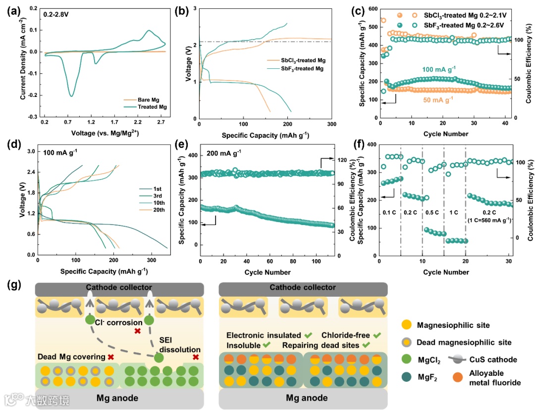 我们以CuS为正极和1.0 M Mg(TFSI)2/DME为电解液组装全电池,进一步验证FRAB@Mg电极的稳定性(图7)。高浓度电解质能够抑制DME溶剂的氧化分解和多硫化物从正极侧的穿梭。从循环伏安曲线,在0.2 V至2.8 V的电压范围内观察到CuS正极的两对还原/氧化峰,对应于两步氧化还原反应,而未处理的镁负极由于界面钝化几乎没有电流响应。对比FRAB@Mg电极,基于SbCl3处理的全电池充电曲线在2.1 V以上即呈现出明显的副反应平台,这是由SEI内部氯化物的溶解和电池壳腐蚀所造成的。FRAB@Mg基全电池在100 mA g-1的较高电流密度下拥有接近100%的高平均库仑效率,并且在20次和43次循环后分别显示出214.8和165.5 mAh g-1的高放电比容量。此外,全电池在0.1、0.2、0.5和1 C(1C = 560 mA g-1)倍率下分别可提供277.9、220.2、94.0和55.4 mAh g-1的比容量。当倍率回到0.2 C时,比容量仍可恢复到216.6 mAh g-1。