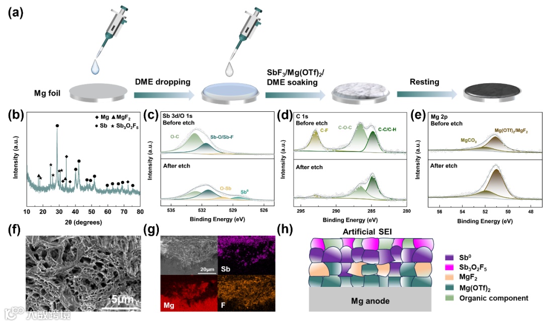 镁负极富氟锑基(FRAB)界面制备过程如图2所示。首先以1,2-二甲氧基乙烷(DME)为溶剂,三氟化锑(SbF3)为溶质,三氟甲烷磺酸镁(Mg(OTf)2)为添加剂,制备预处理的白色悬浮液。CF3SO3-基团中的富电子O可以与SbF3的Lewis酸性位点相互作用,降低Sb-F的离子键强度,促进氟化物的分解。X射线衍射(XRD)图谱检测到Sb金属以及MgF2的特征峰,证明了Mg-Sb置换反应的成功发生。这种单斜MgF2中独特的一维通道有助于增强Mg离子在SEI的传输。此外,SbF3还与CF3SO3-的强路易斯碱性O反应产生少量的氧氟化锑(Sb3O2F5)。X射线光电子能谱(XPS)也证实了镁负极表面经氟化处理后上述物种的存在。形貌特征表明SEI表面多孔网络一方面有利于电解质的润湿,另一方面,较大的比表面积有利于降低局部电流密度,抑制Mg枝晶的生长。EDS图谱显示,上部多孔区域中的Sb信号对应于Sb金属和Sb3O2F5,而下部区域中的Mg元素的信号主要对应于MgF2和Mg(OTf)2。