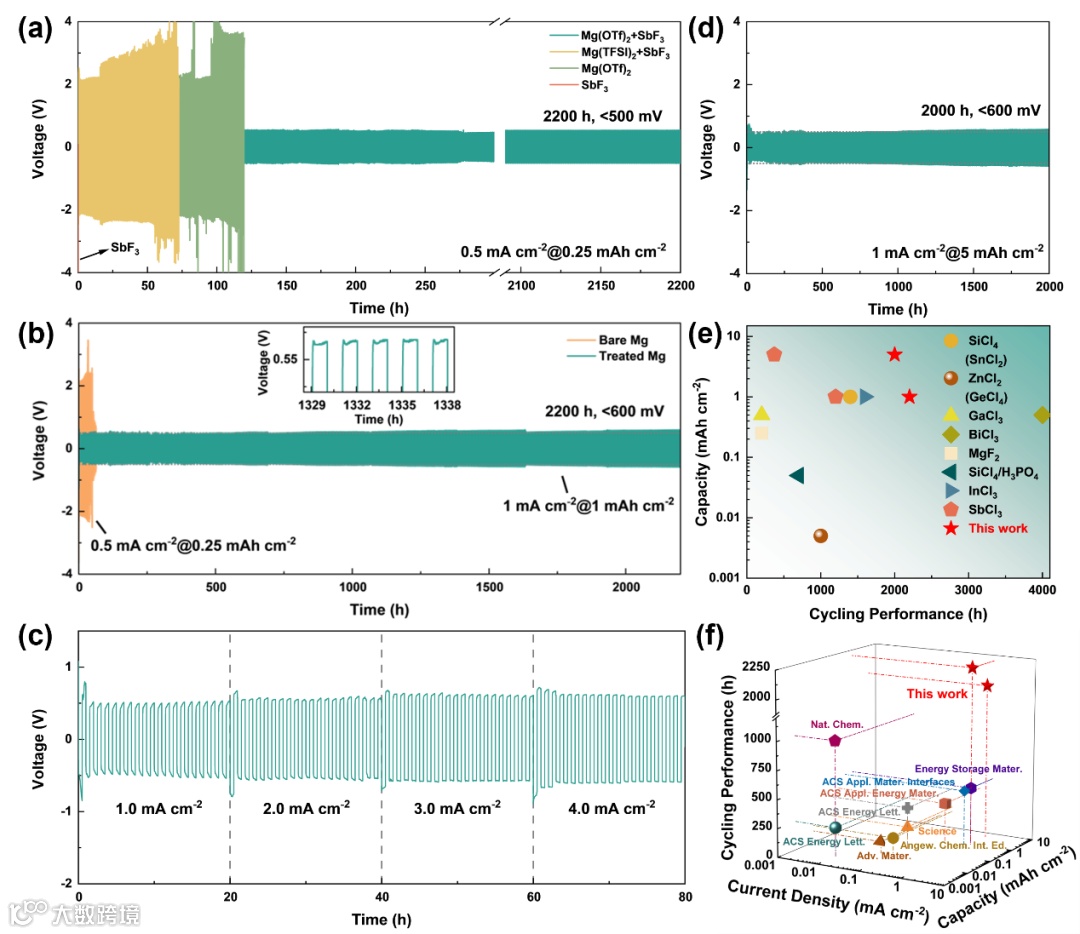 我们探究了FRAB界面对镁负极电化学性能的影响,如图3所示。由于置换反应所产生的Sb3O2F5和MgF2都是电子绝缘的,因此可以有效抑制电解质在镁负极表面的分解副反应。并且,改进的FRAB@Mg对称电池Rct显著减少,证明了疏松多孔的亲镁Sb骨架以及MgF2和Mg(OTf)2能够增强Mg离子扩散和界面反应动力学。Tafel表征进一步验证了富氟锑基界面对Mg沉积/剥离行为的调节作用,使得改性Mg电极的交换电流密度为未修饰Mg电极的350倍。此外,FRAB@Mg对称电池的形核和沉积过电位远小于未修饰Mg的电池,说明该人工SEI促进了镁离子通过界面层的快速转移和镁的均匀沉积。如图4所示,FRAB@Mg对称电池在0.5 mAcm-2的电流密度和0.25 mAh cm-2的容量下以小于500 mV的过电势可保持超过2200小时的稳定循环。当电流密度增加到1 mA cm-2时,FRAB@Mg对称电池在2000小时以内仍显示出稳定的过电位(600 mV)。与过去报道的无氯RMBs相比,我们的镁负极改性策略赋予电池和电解质优异的循环稳定性和电化学稳定性。