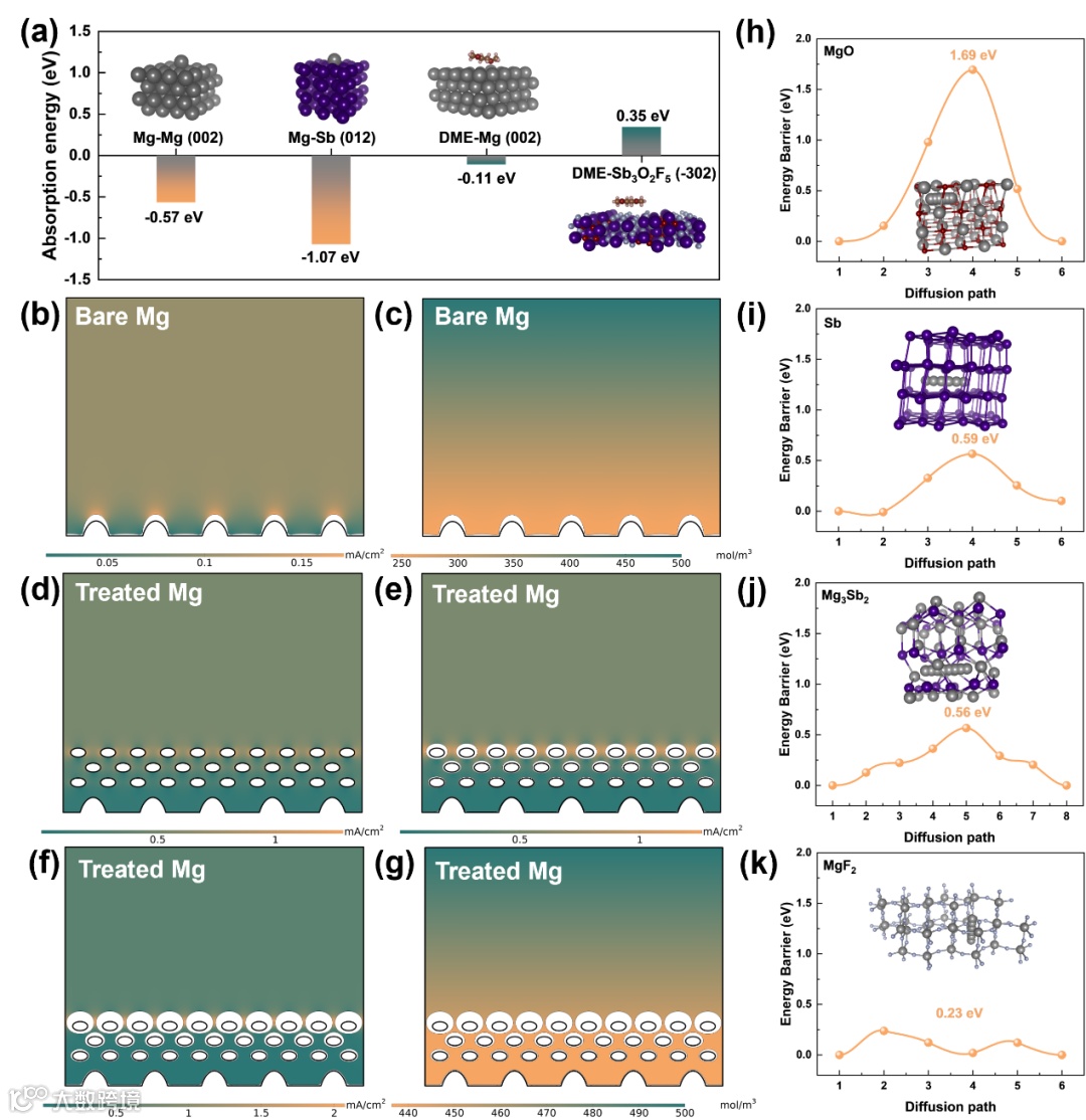 为了研究对称电池长期稳定循环的潜在机制,我们对循环后FRAB@Mg电极表面形态和成分进行了表征,如图5所示。与之前报道的未改性镁电极的粗糙表面不同,改性后的镁负极界面亲镁Sb可以有效调节镁沉积/剥离行为,使得FRAB@Mg电极在100次循环后表现出光滑平坦的沉积形貌。选区电子衍射(SAED)证明循环后的FRAB@Mg电极界面Mg3Sb2组分主要以纳米晶的形式存在,丰富的不饱和Mg-Sb键可进一步加快Mg2+在SEI中的迁移。循环100圈后Sb金属和Mg3Sb2合金的XPS峰明显强于Sb-O/Sb-F,证明初始SEI中的Sb3O2F5逐渐还原为Sb金属并补偿亲镁位点的减少。此外,亲镁位点在循环过程中的持续释放使得Sb骨架比初始人工SEI中的骨架更大。密度泛函理论(DFT)计算验证了Sb金属的亲镁性(图6)。同时,DME分子在Sb3O2F5(-302)面上的吸附能远高于Mg(002)面,说明Sb3O2F5能够保护FRAB@Mg电极不被界面DME钝化,加速镁离子的脱溶过程。FRAB@Mg电极表面导电Sb骨架均匀镁离子流,促进了“hot spot”的横向分布,并抑制了枝晶的垂直生长。不同组分的迁移能垒表明,亲镁Sb骨架和置换反应产生的单斜MgF2的迁移能垒远低于先前报道的传统MgF2(1.23 eV)、MgO(1.69 eV)和MgCO3(2.17 eV)的迁移势垒。镁离子在多个组分中的快速扩散进一步促进了镁的均匀分布和沉积。