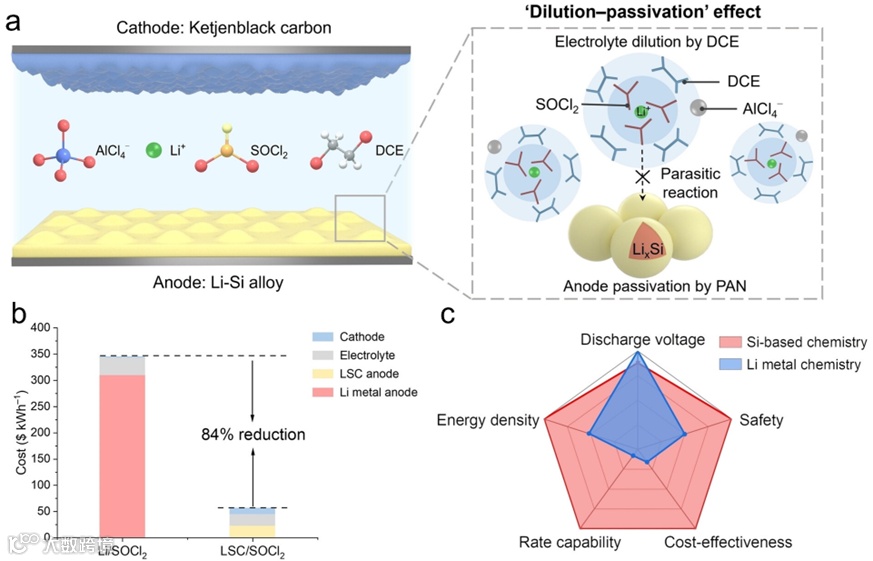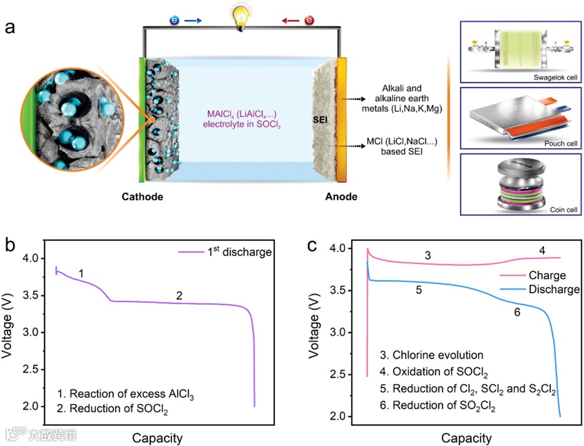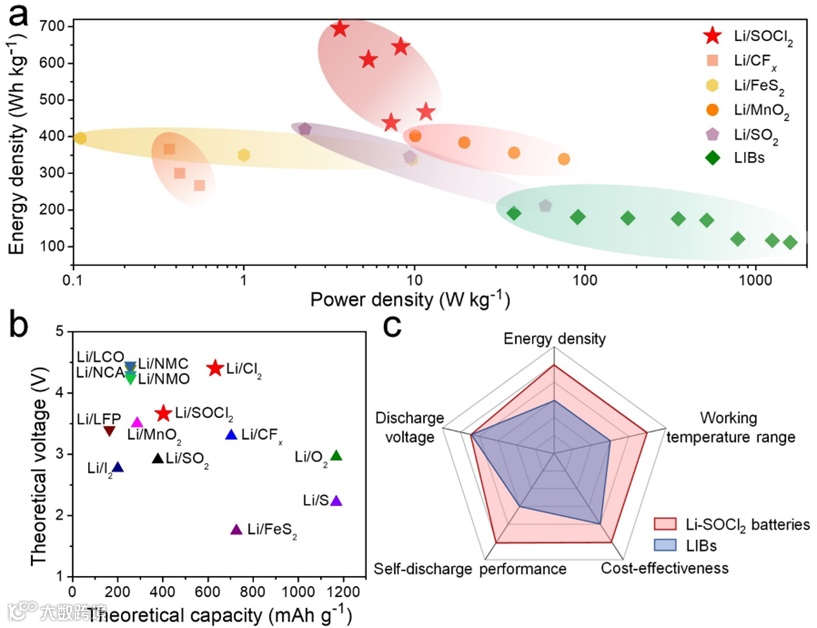 Li-SOCl2一次电池是高能量密度电池的一个典型例子,放电时正极 SOCl2 还原成 S、SO2 和 LiCl,负极侧发生锂的溶解。与传统锂离子电池相比,它的优势可归纳为以下几点:(1) 高能量密度:Li-SOCl2电池的实际能量密度通常高达 420 Wh kg-1,在低放电倍率下超过 700 Wh kg-1。(2) 运行温度范围广:Li-SOCl2电池可在 -60 °C 至 150 °C 的温度范围内正常工作。(3) 成本低:Li-SOCl2电池以价格低廉的碳正极和SOCl2 电解质为活性材料。(4) 保存期长:Li-SOCl2电池的年自放电率通常低于 1%,在正常工作条件下可达到 10 年以上的储存寿命。(5) 优异的放电电压:Li-SOCl2电池可在3 V 以上电压持续输出电池总容量的 80%-90%,放电平台非常平稳。